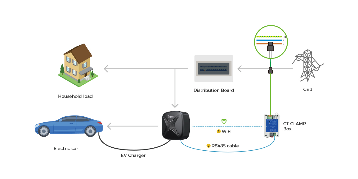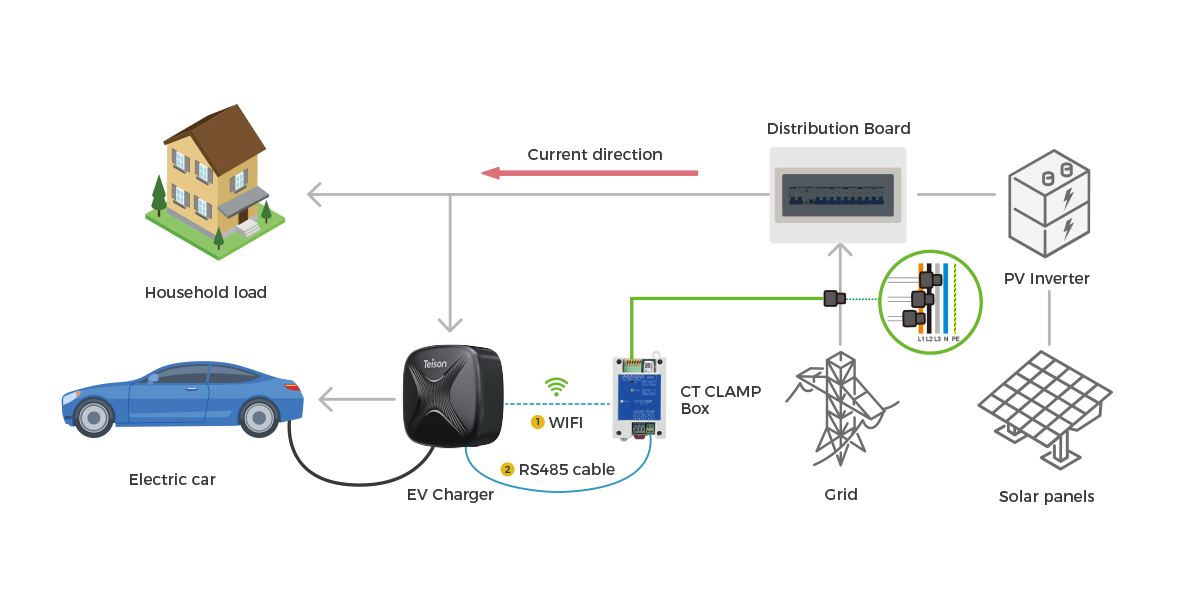 Wanneer een woning is aangesloten op een zonne-energiesysteem, kan stroomverdeling worden gerealiseerd via CT-klemmen of specifieke RS485-energiemeters. Hierdoor kan het overschot aan zonne-energie worden toegewezen aan het laadstation voor gebruik.